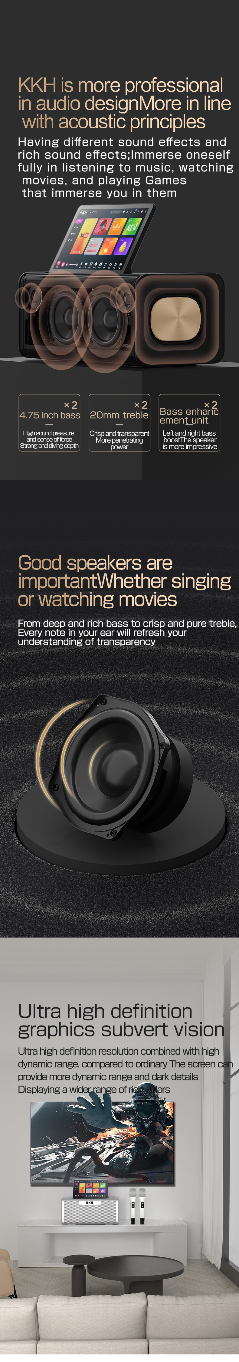 It is a multi-functional portable all-in-one machine that integrates song-demanding host, touch screen, pre-amplifier, post-amplifier, audio, and microphone receiver. No installation, plug and play. Professional-grade HiFi shocking sound, high-intensity explosive and penetrating sound, restoring live listening.Perfect for party, family karaoke, weddings, gatherings outdoor/indoor activities.
